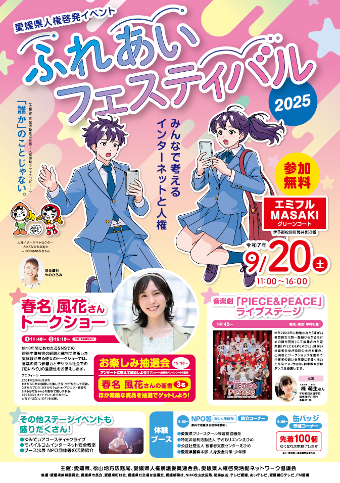 2025年9月20日、エミフルMASAKIで開催されました愛媛県人権啓発イベント「ふれあいフェスティバル2025」にインターネット安全教室の講師としてボランティア参加いたしました。