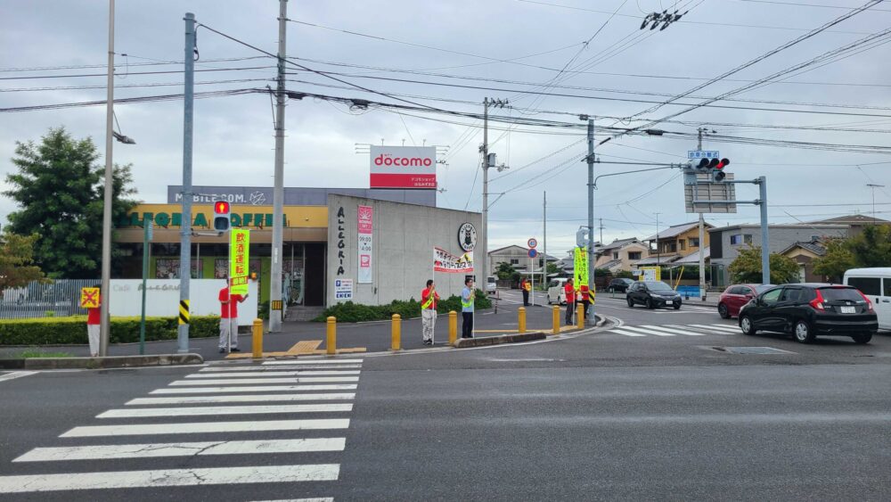 9/25(木) 秋の全国交通安全運動期間に合わせ、モバイルコム本社(ドコモショップはなみずき店)前の交差点付近で交通安全運動協力キャンペーンを行いました。