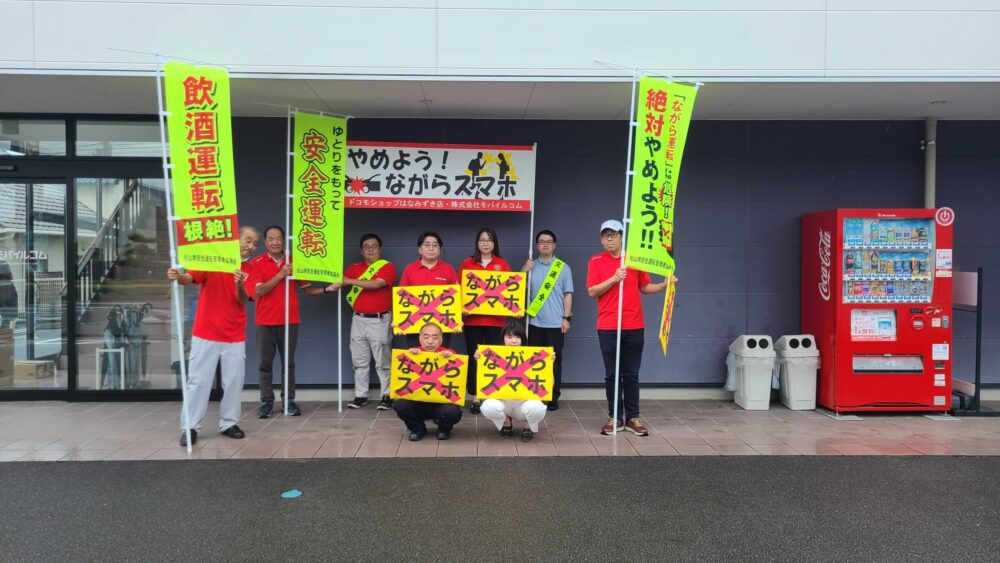 モバイルコムでは、年2回交通安全運動を行うことで、地域のみなさんに呼びかけを行うと同時に自分たち自身の交通安全の意識を高めています。